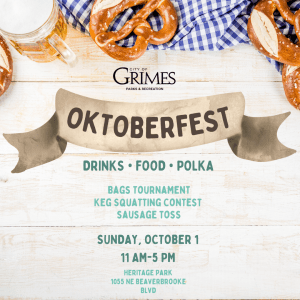 Grimes is ready for their first Oktoberfest this year. Partnering with Destination Grille, which will provide the Oktoberfest specialties, beer and food, the inaugural fest will also feature live music, a bags tournament, a keg squatting contest and the City of Grimes’ very own sausage toss! Come out to Heritage Park and have some fun. Prost!
