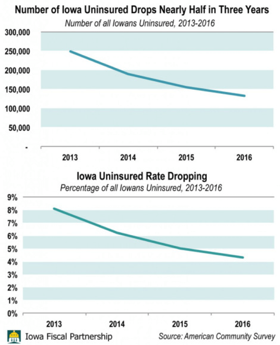 The data shows that Iowa’s uninsured population has dropped with the advent of the ACA, or Obamacare. Census data show uninsurance in Iowa dropped by nearly half in just three years, by about 116,000 — from 8.1 percent uninsured in 2013 to 4.3 percent in 2016.