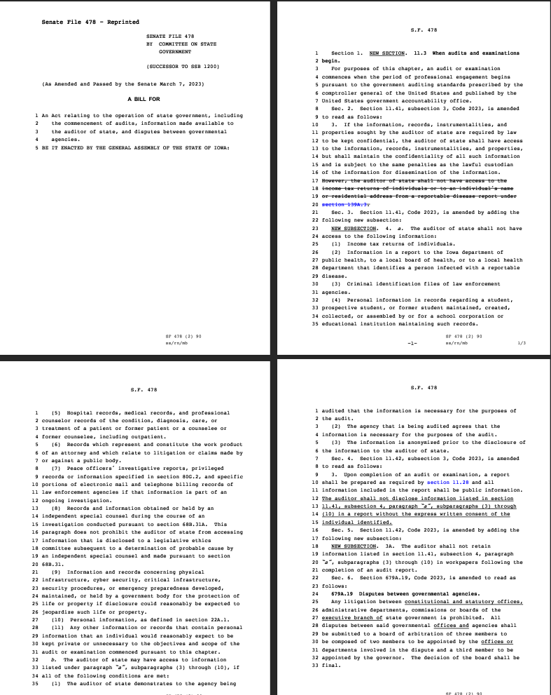 Iowa Republicans have framed the bill as a “privacy protection act” and as a way to keep the auditor’s office in line with “generally accepted government auditing standards,” which the office already adheres to.