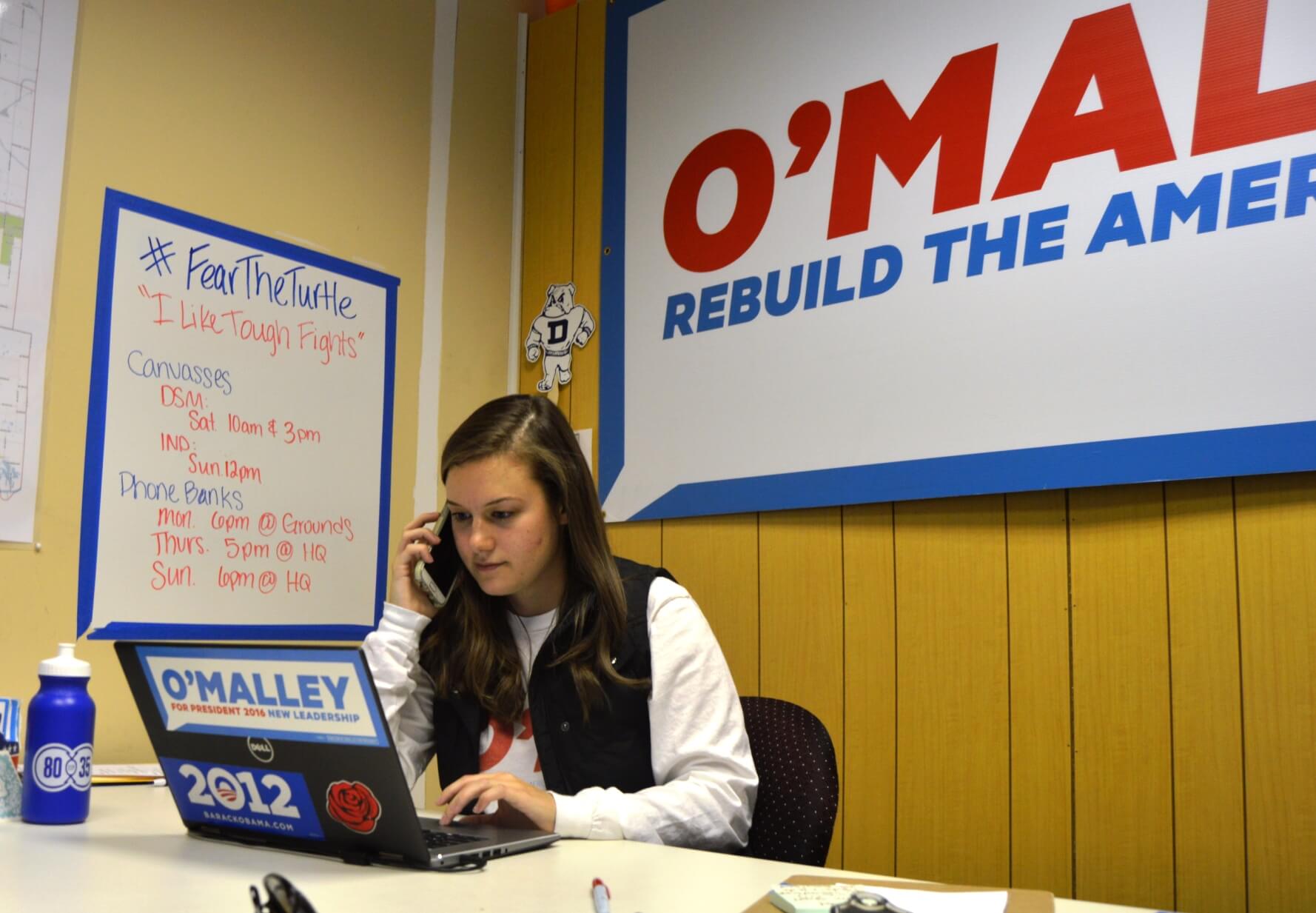 Rolling into the downtown O’Malley headquarters office before 9:00 each morning, Sabine hops on a 9:30 conference call with the rest of the statewide field staff, then gets started early on the campaign task that takes up the majority of any given week: phone-calling. Churning through lists of likely caucus-goers over the age of 65 is the order of the morning.