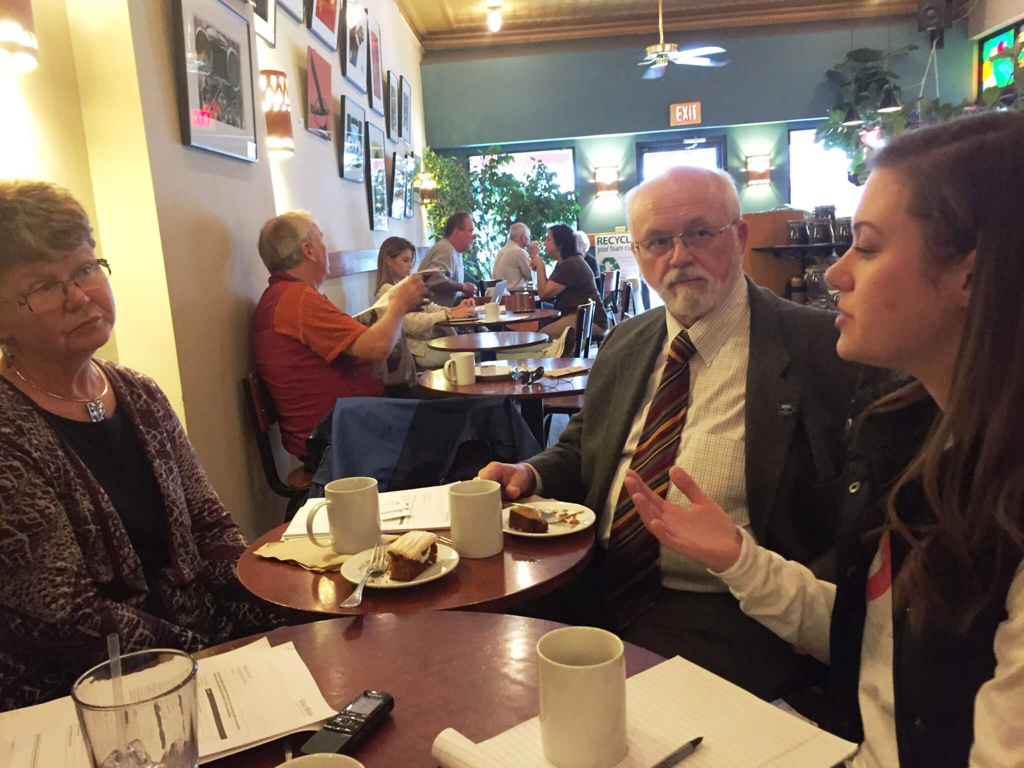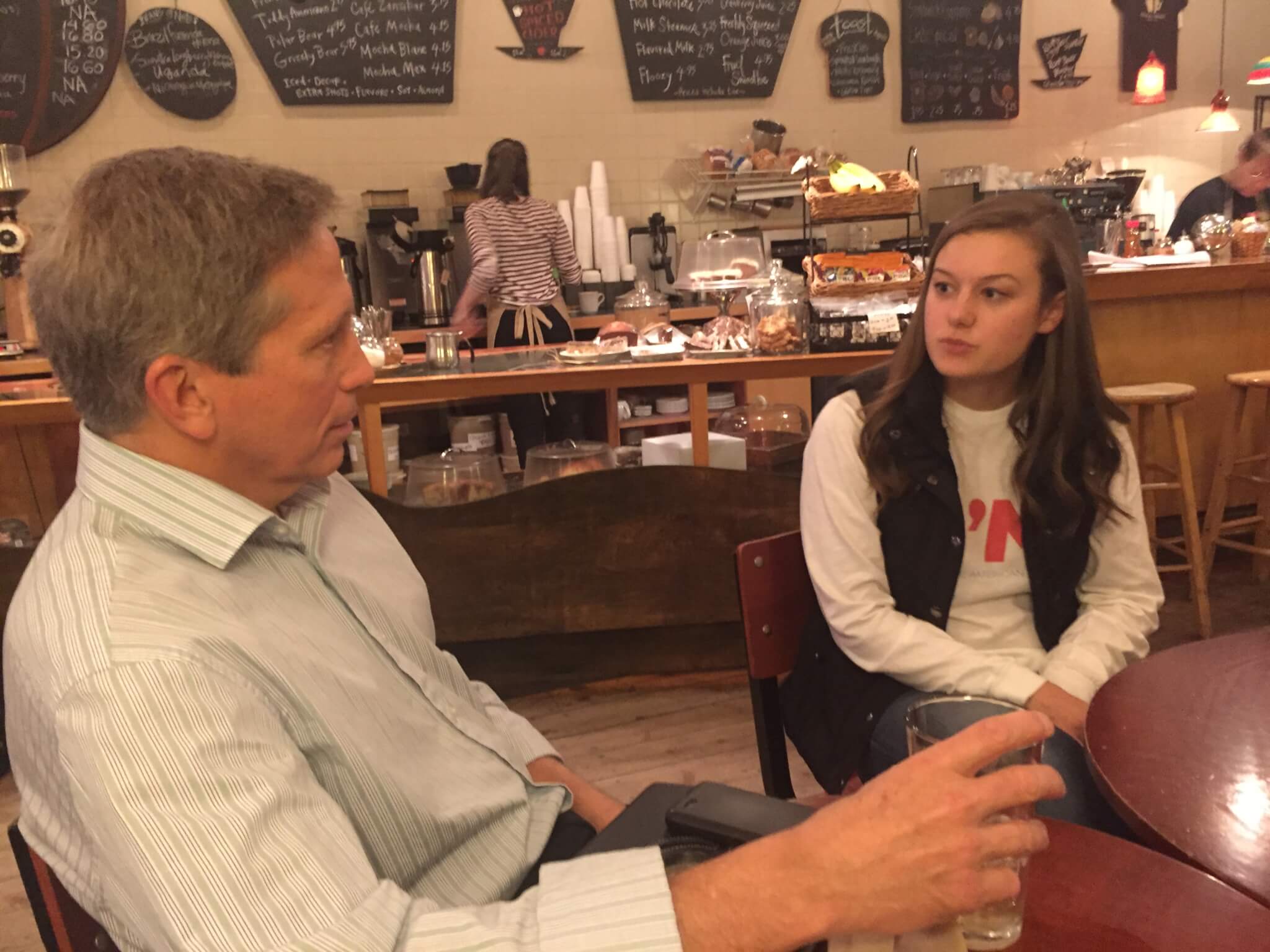 “I wanted to ask how do you guys want to get involved in the campaign? Do you like phone banking, door-knocking?” Sabine inquires of both of them as they snack on pastries at the coffee shop.