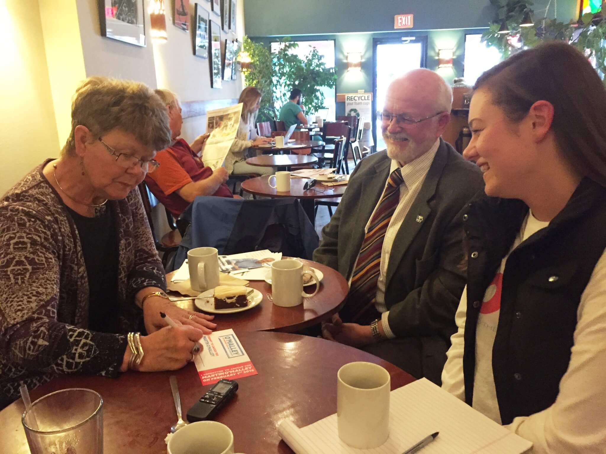 After business is discussed, the three chat about various policies, and the conversation meanders for a while about Medicare and healthcare plans. The Whitworth’s choice with O’Malley is partially practical, seeing him as the most electable candidate who also boasts a solid progressive record.