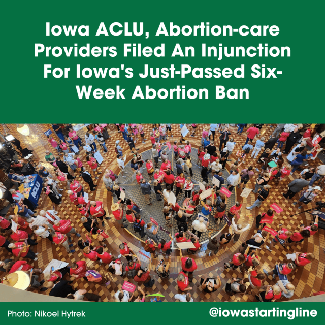 The American Civil Liberties Union (ACLU) of Iowa, plus Iowa abortion care providers Planned Parenthood and the Emma Goldman Clinic, filed a challenge to the abortion ban passed Tuesday by the Iowa Legislature.