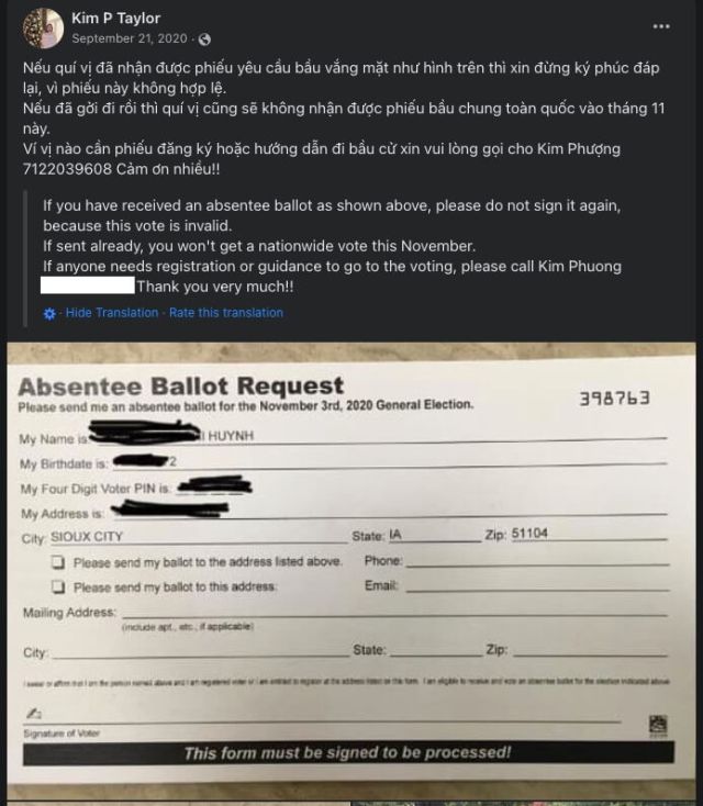 Kim Taylor allegedly approached members of the Sioux City Vietnamese community, including those who the indictment says had limited ability to read and understand English, and offered to help them vote. Kim Taylor would visit the homes of these Vietnamese community members and bring voter registration forms and absentee ballot forms and, in some cases, fill them out on their behalf.