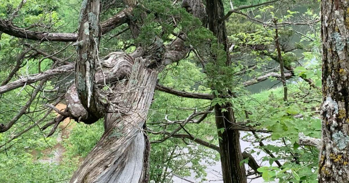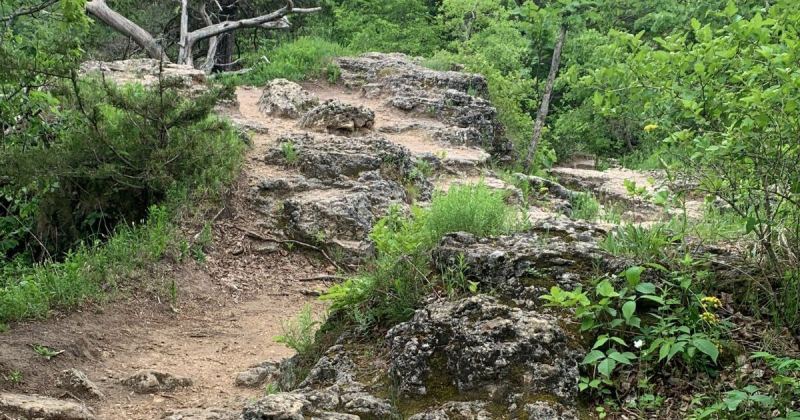 The Backbone Trail is the “highest point in northeast Iowa,” according to the Iowa DNR, and thus is a great place for spotting swooping eagles, turkey vultures, and hawks, plus just naturally taking in the views. Besides the very cool-looking ancient dolomite, the twisted, craggy cedar trees at the top are another unique feature of the trail.
