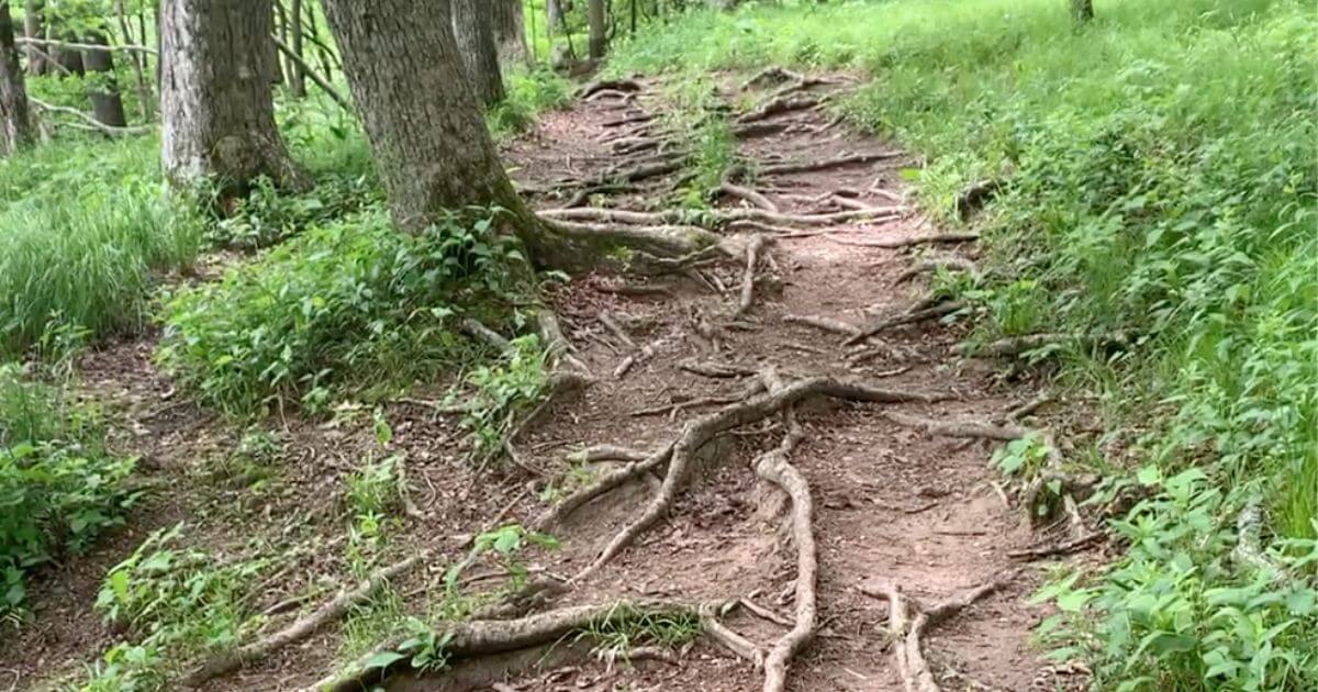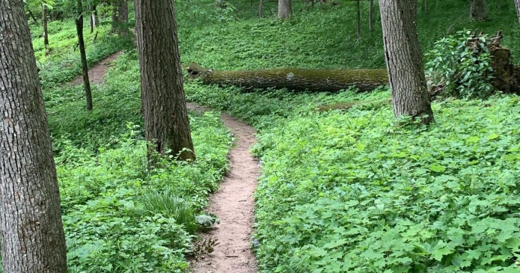 Once you’re past the short rocky cliff section, the trail descends down into the forested river valley and loops around itself to follow the loop of the Maquoketa River, which carved out those cliffs over millennia (now so low, you could walk right across). You’ll still have to watch your step on this section, but this time it’s for the numerous tree roots providing a natural staircase around the loop.