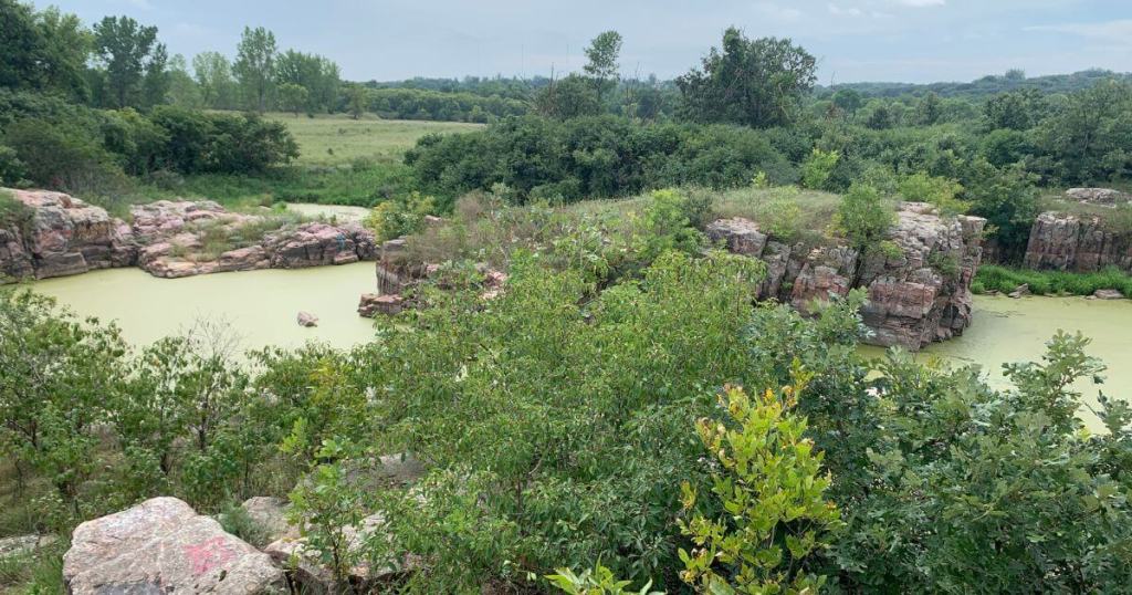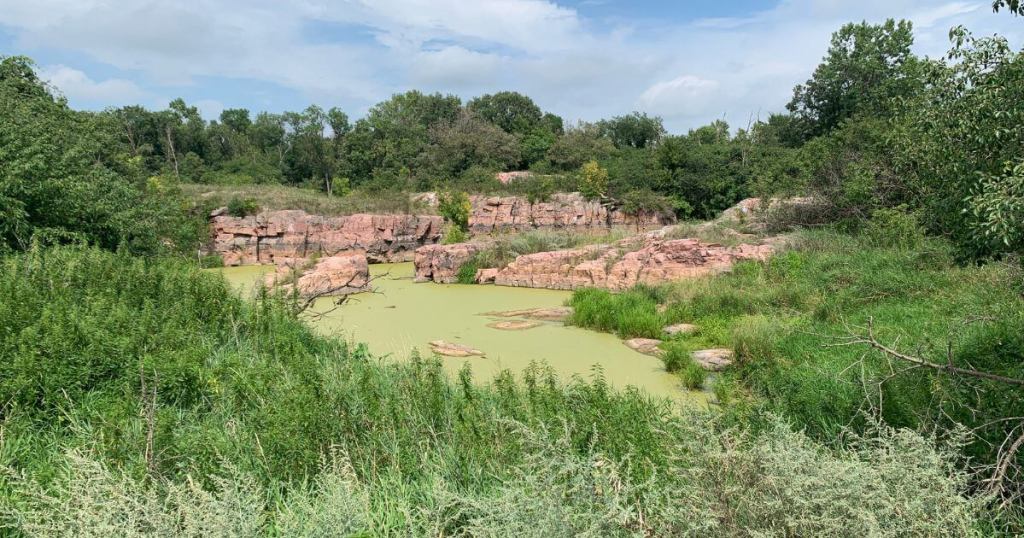 The woods provide a nice, shady respite for a bit, though there’s enough sun peeking through to grow yellow black-eyed Susans to my height. And once you hit the other side of the trail, where three states meet (hi Minnesota!), you can loop around through those woods and even catch a glimpse of the old quarry, Jasper’s Pool.