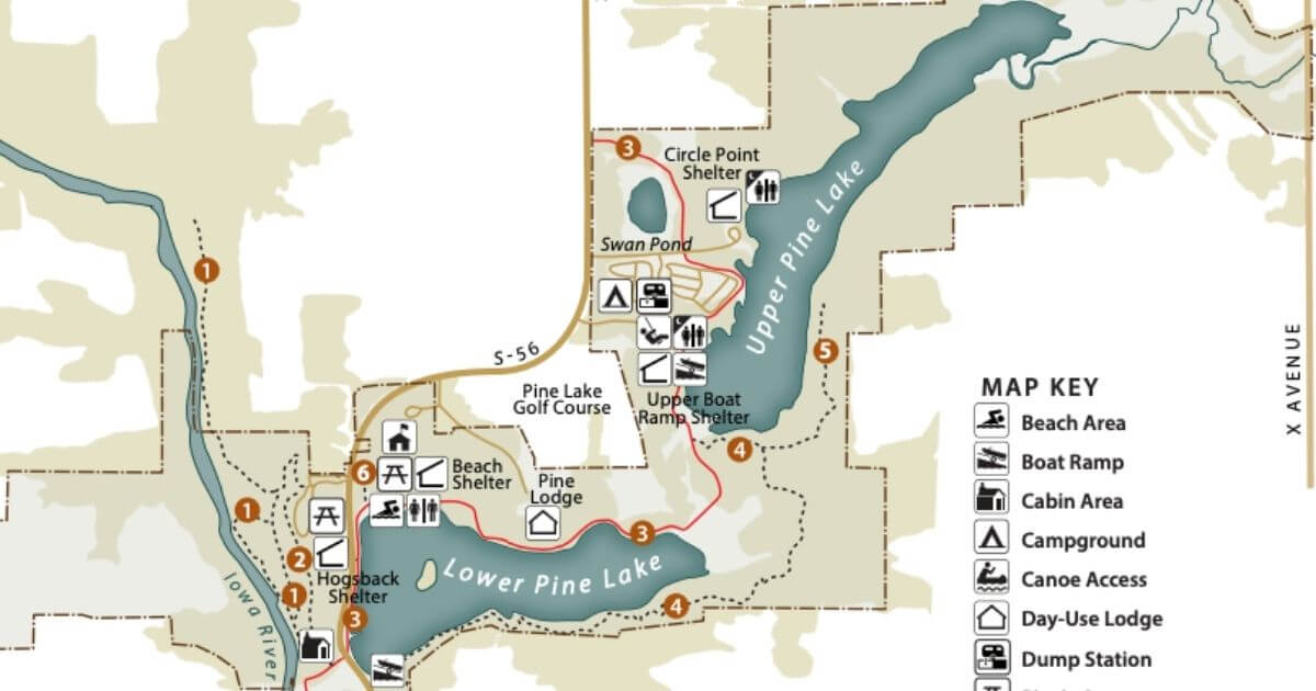 There are six official hiking trails at the 654-acre Pine Lake State Park, including one paved bicycle trail. The Iowa Department of Natural Resources (DNR) rates four of them, ranging between 0.3 to the 2.6-mile paved trail, as “easy,” and the remaining two as “moderate” difficulty (though one of those, the Beach Trail, is only one-tenth of a mile).