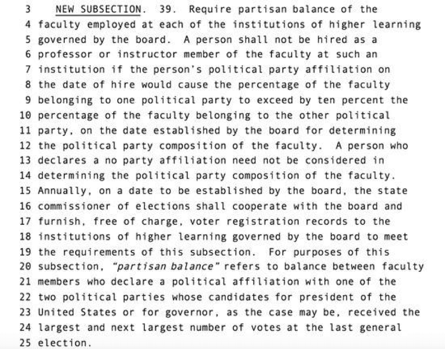 This proposal, however, is not the only one filed this session intended to bring Iowa’s public universities to heel. SF 288, filed by Senator Mark Chelgren (R–Ottumwa), would require “partisan balance” among the faculty at public universities, imposing a hiring freeze until achieved. Take a look: