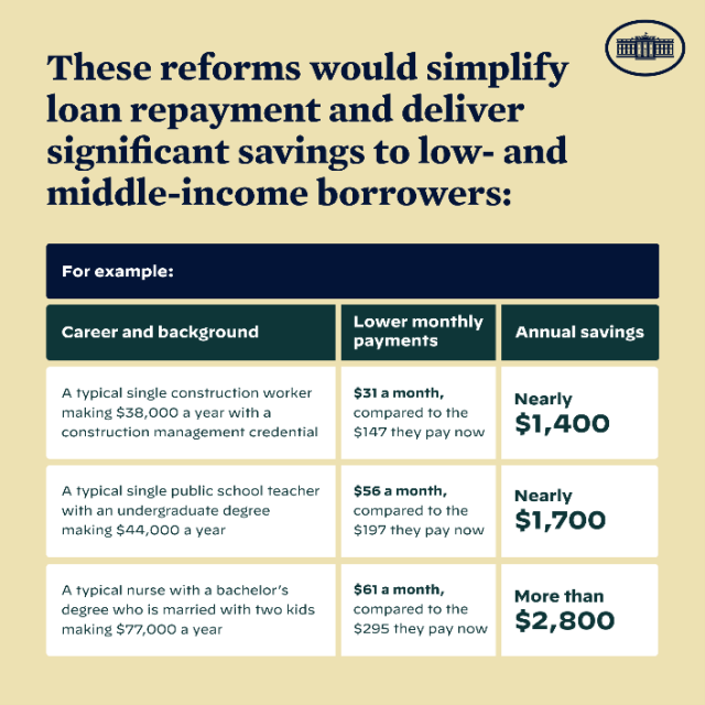 Current and future lower- and middle-income borrowers on income-based repayment plans will also get further relief under Biden’s new rule. The order will: