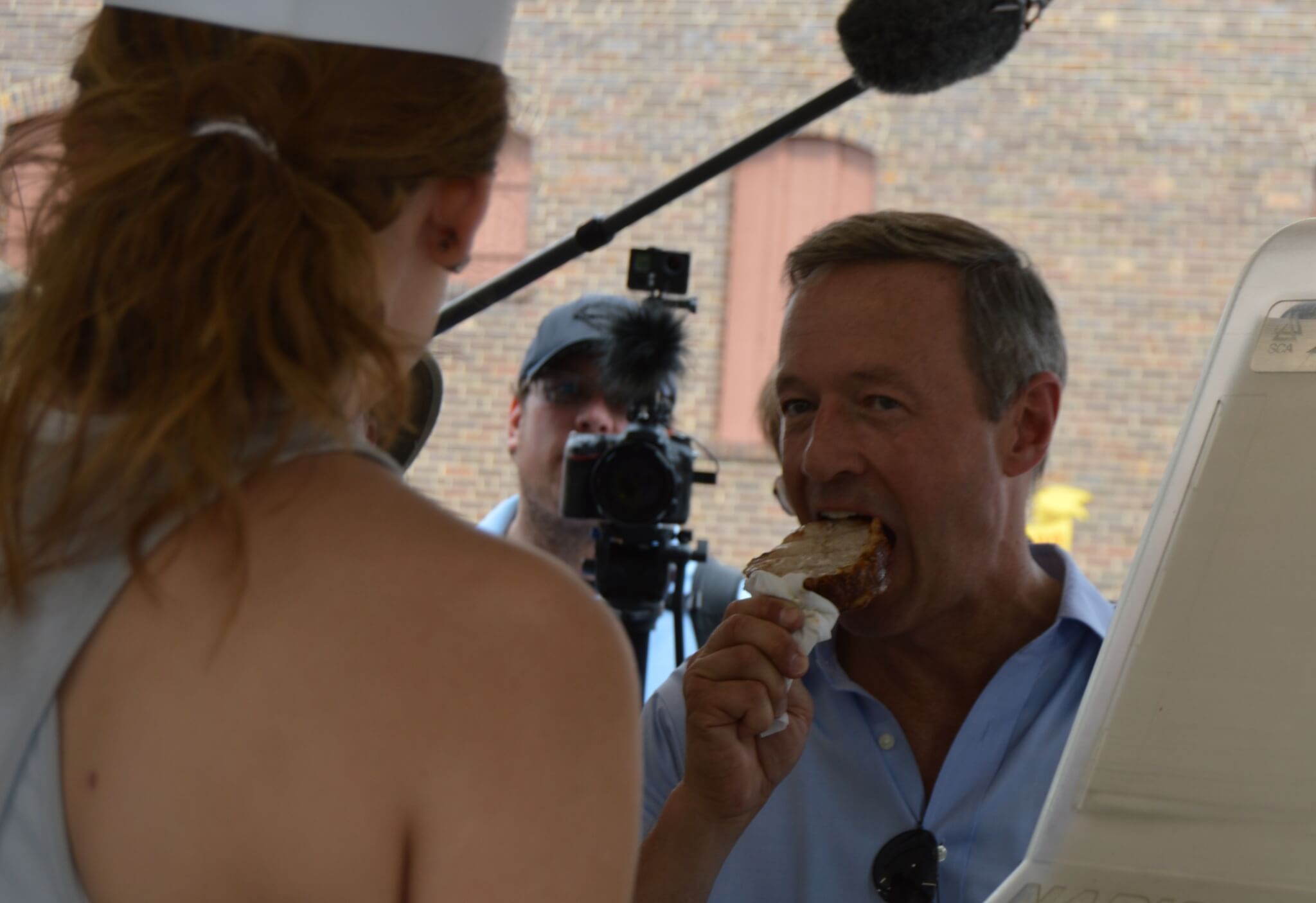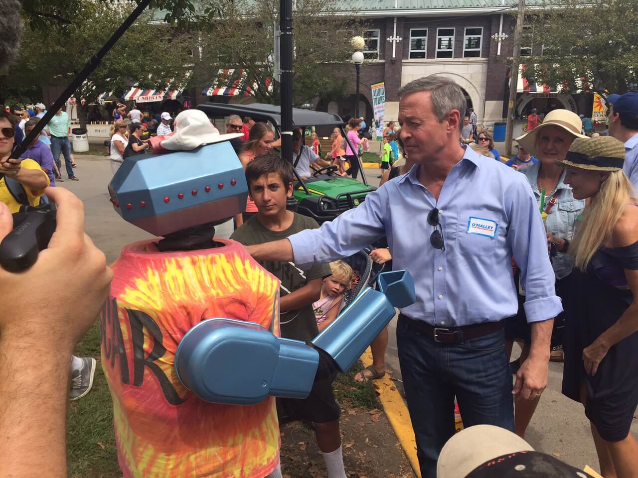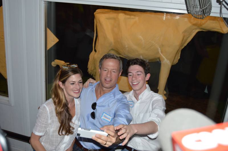O’Malley and his children, Grace and Will, traveled a good section of the Fair, from the Varied Industries building (O’Malley checked out a virtual reality set at the ISU booth) to the slide, to the Butter Cow, where he got a family selfie with the sculpture in the background. Along the way they stopped and chatted with dozens of fair-goers and took questions from the many reporters that followed his every move. As any candidate must, of course, O’Malley also picked up a pork chop-on-a-stick for him and his son at the Pork Producers stand (O’Malley finished his pork chop in a very quick four minutes time).