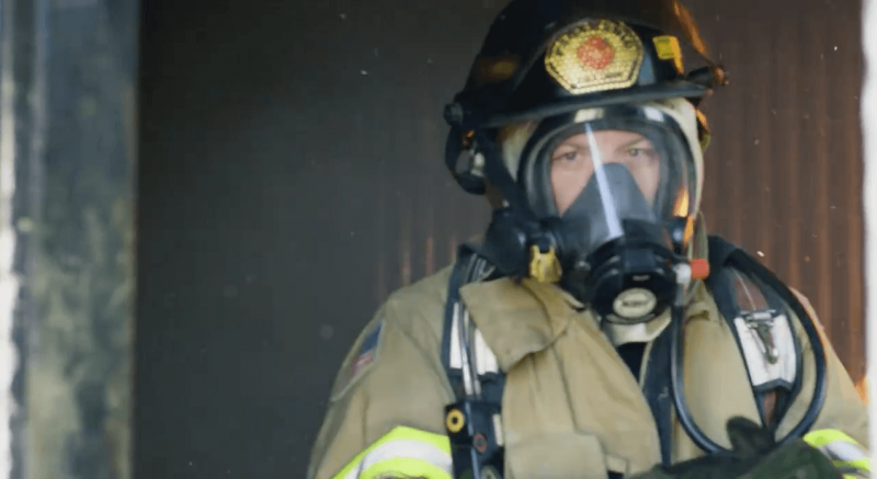 “Firefighters don’t run from trouble, they run towards it,” Brase tells the camera after dousing some water on a (presumably) fake fire as he’s suited up in his firefighting gear.