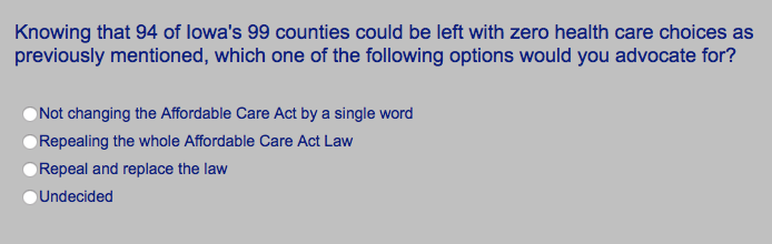 Last week he stated, “If people – as many have wished – get their way and the ACA continues to remain the exact same as it was signed into law by President Obama, the health care access for tens of thousands of Iowans begins to dry up. If President Obama’s law is not changed by a single word, every single one of the residents not getting their insurance through their employer or on another government health care program in the sixteen counties of the Third Congressional District would be left with zero health care options.”