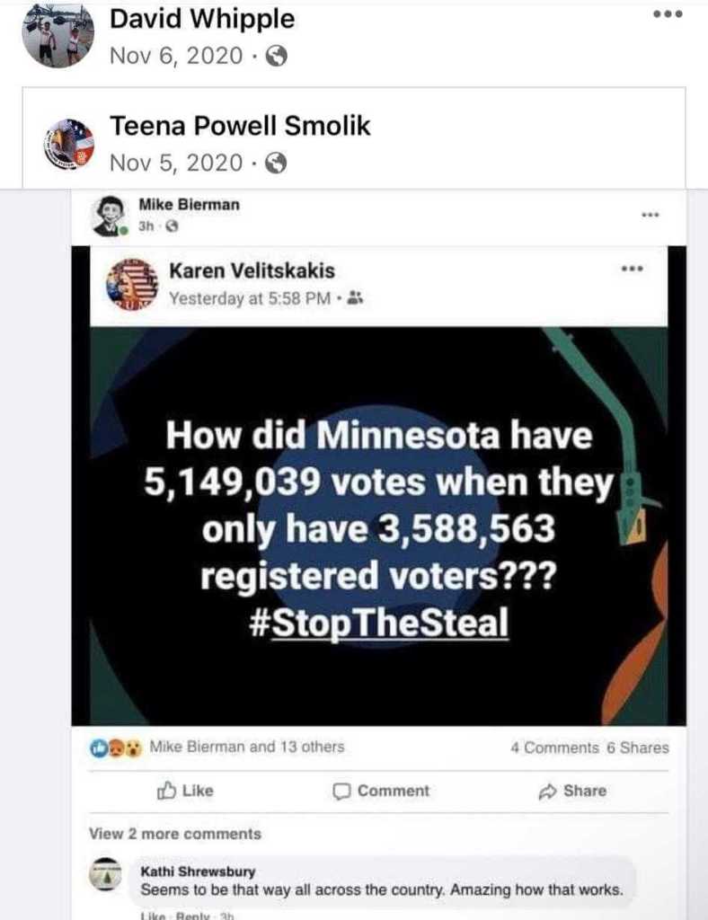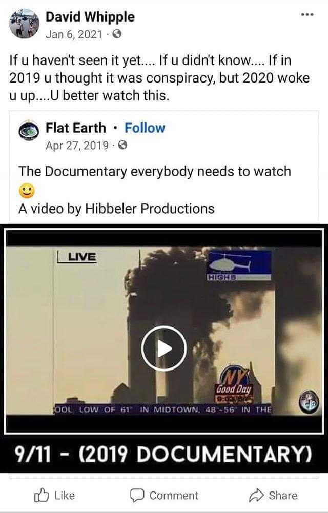 In since-deleted posts, Whipple shared various conspiracy theories about the election, QAnon, and even the 9/11 terrorist attack.