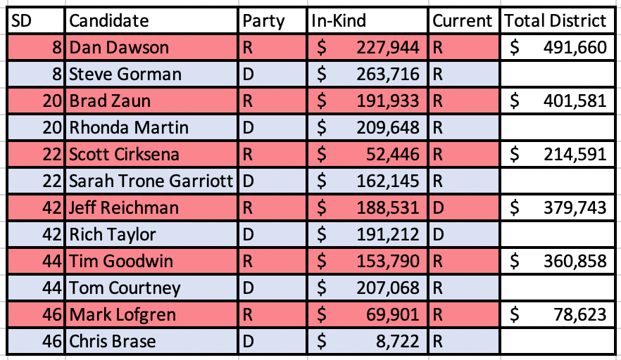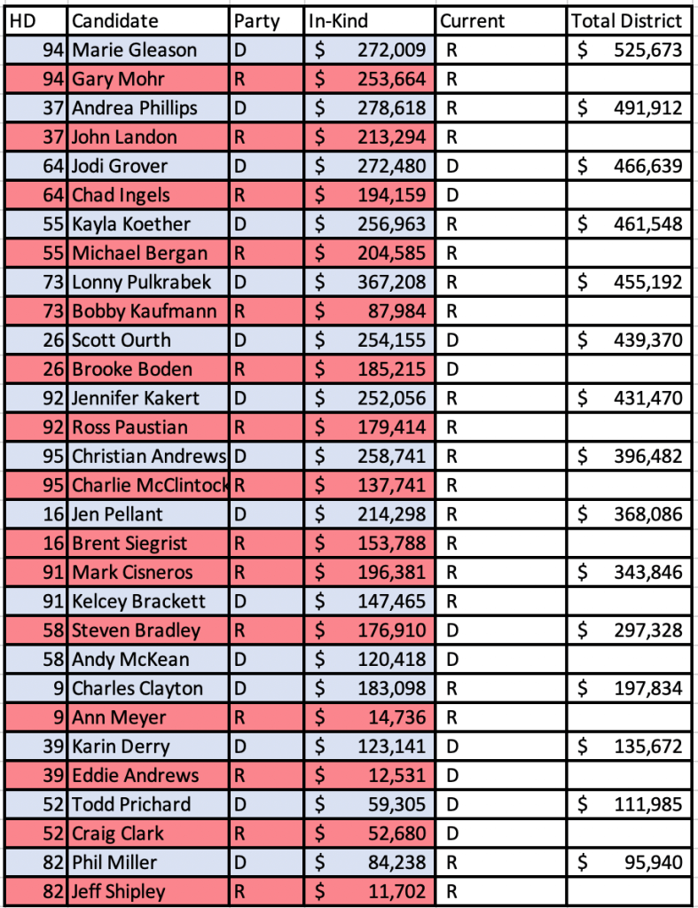 Here’s the in-kind list sorted by the districts seeing the largest combined spending in the final two weeks, taking out a few with lower totals.