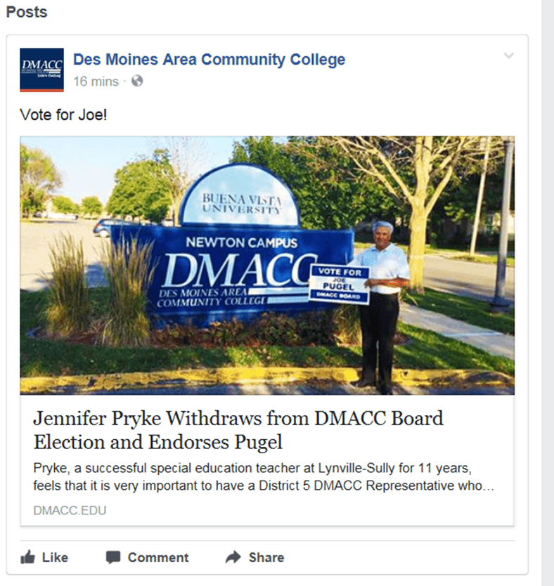 Another concern arose over some social media posts by DMACC. A third candidate in the District 5 race, Jennifer Pryke, dropped out of the race in August, endorsing the incumbent Pugel as she did so. DMACC sent out her press release of her withdrawal, including the part where she endorsed Pugel and included a picture of Pugel holding one of his yard signs. A Facebook post from DMACC’s account included the text “Vote for Joe!” with the accompanying press release.
