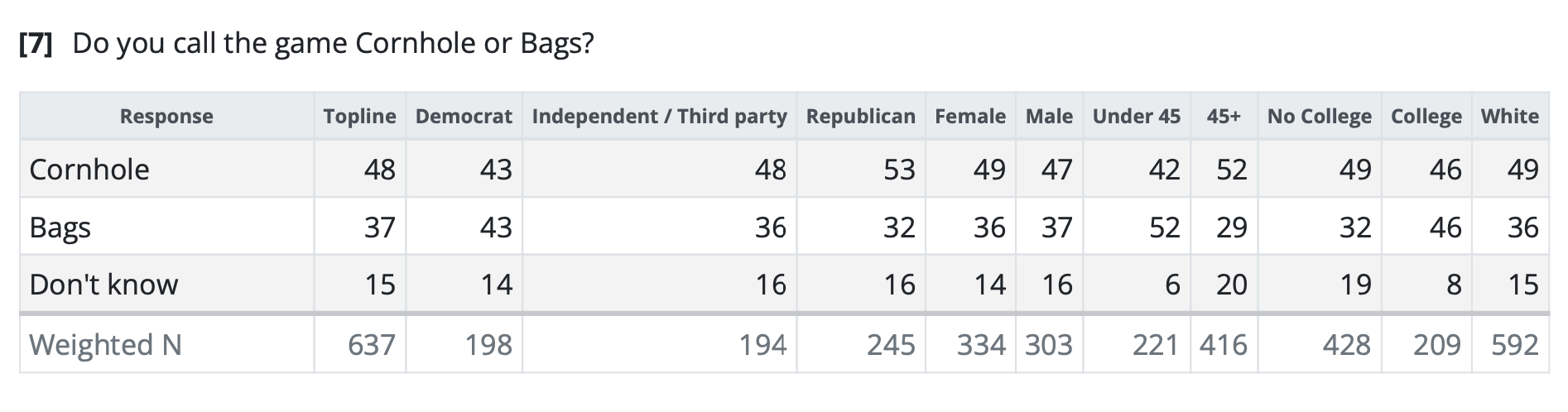 And while cornhole is the favored choice overall in Iowa right now, it may not be forever. Our poll showed that Iowans under age 45 actually prefer the bags name, 52% to 42%. Those over the age of 45 had a very strong preference for cornhole, 52% to 29%. So perhaps the cornhole designation is an older generational thing, one that could lose its prominence over time.