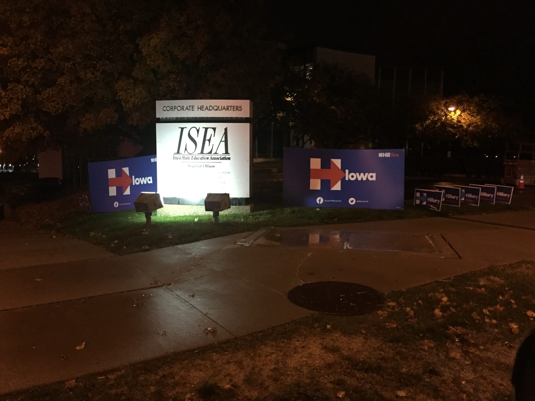 Signs were placed early outside of the ISEA headquarters, helpfully located directly across the street from Vets Auditorium. The National Education Association union endorsed Clinton a few weeks ago.