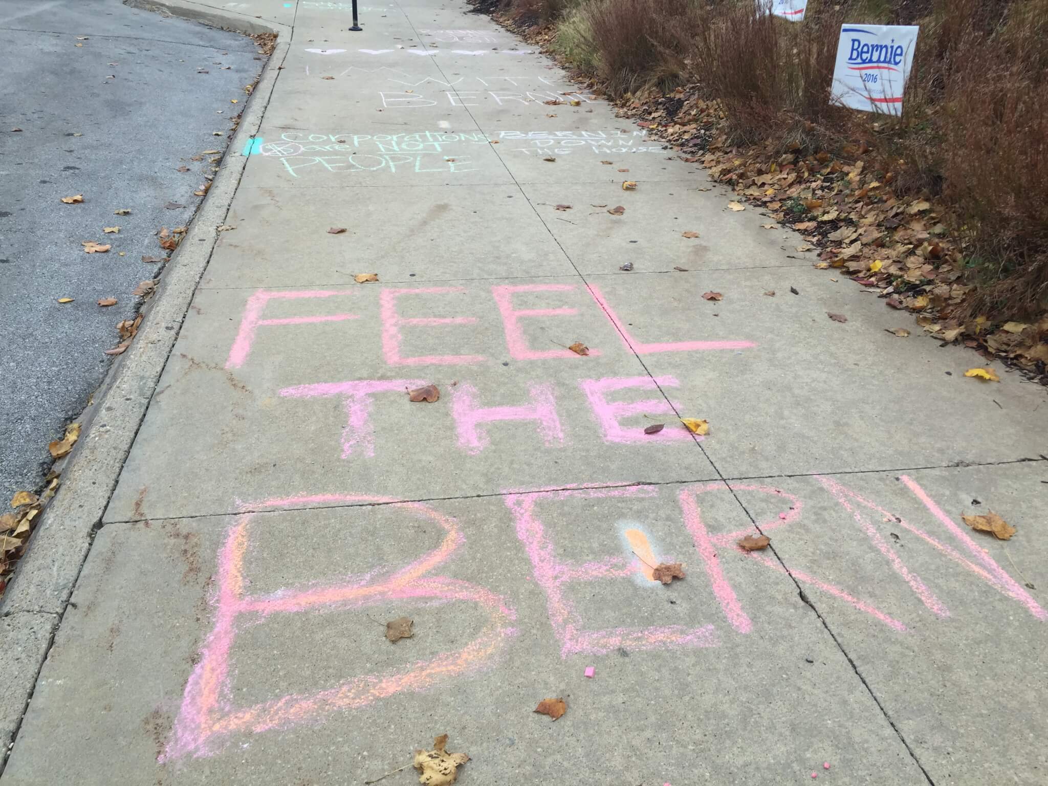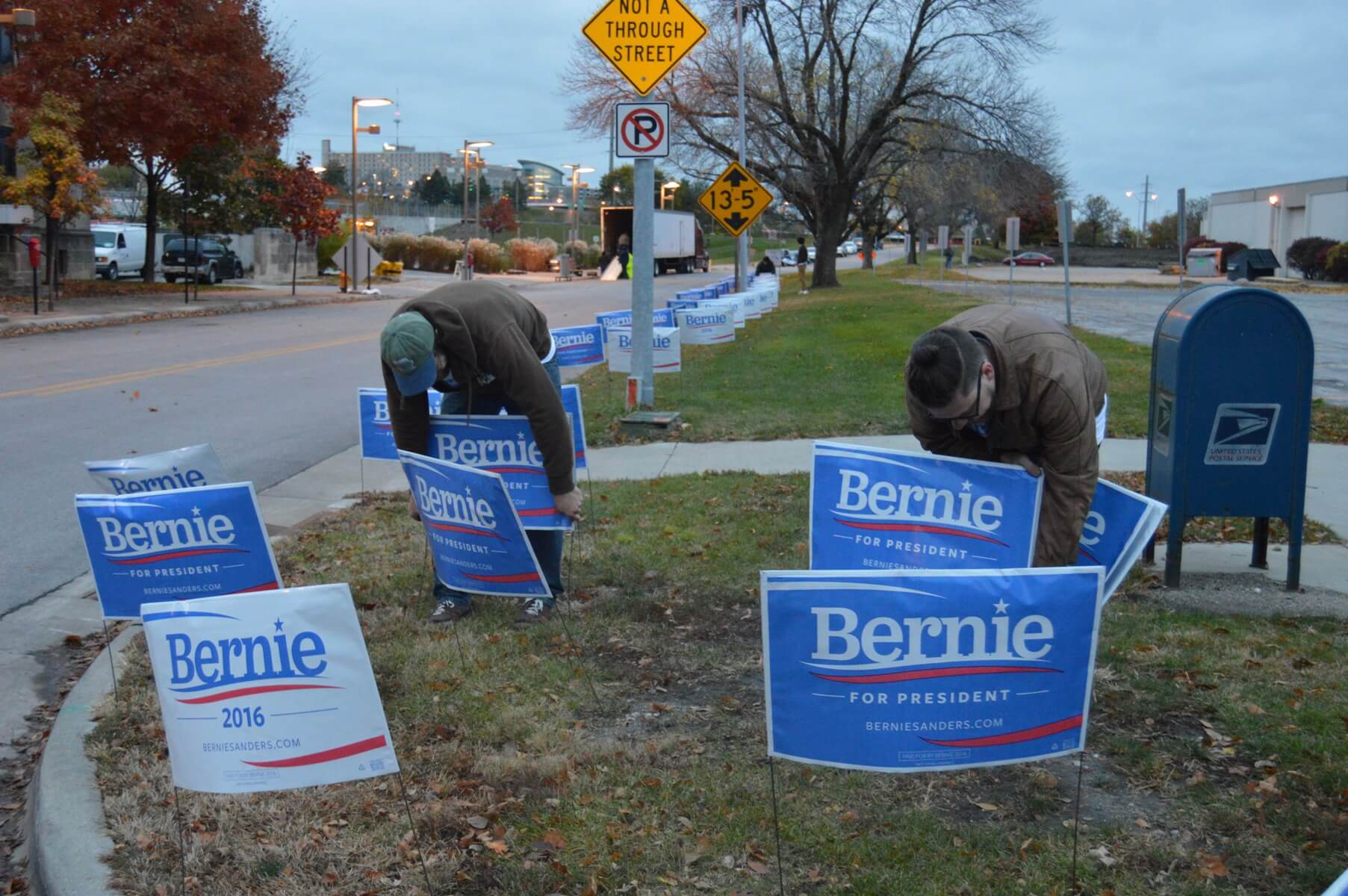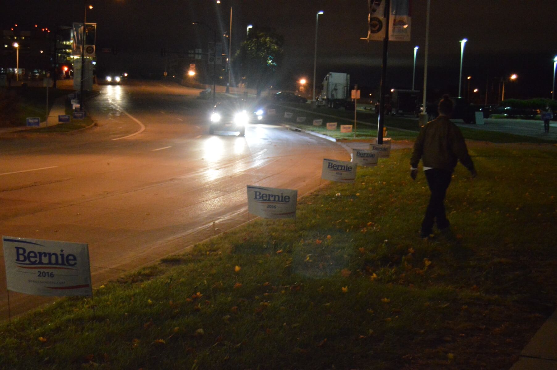 Sanders is planning on hosting a large rally across the river at the armory, then marching over to the JJ Dinner with a throng of supporters in tow. Many insurgent Iowa Caucus campaigns have used large marches to show off their organizational abilities and use it to project a man-of-the-people look. A smaller crew of Sanders staffers worked this morning to line the route with signs.