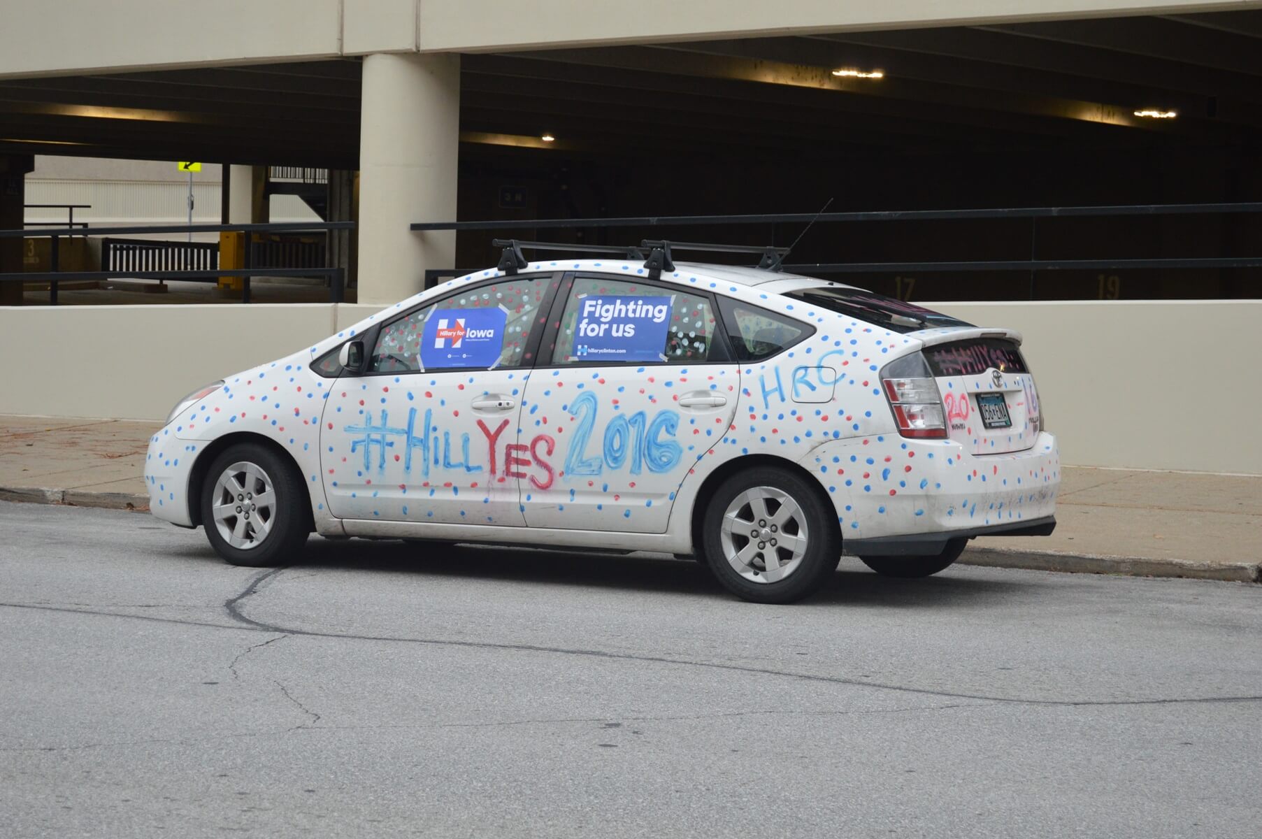The Clinton team was out bright and early this morning, looking to secure 5th Avenue outside the event hall. They parked their cars up and down the streets, and reapplied paint to them this morning (after the rain last night washed off their designs).