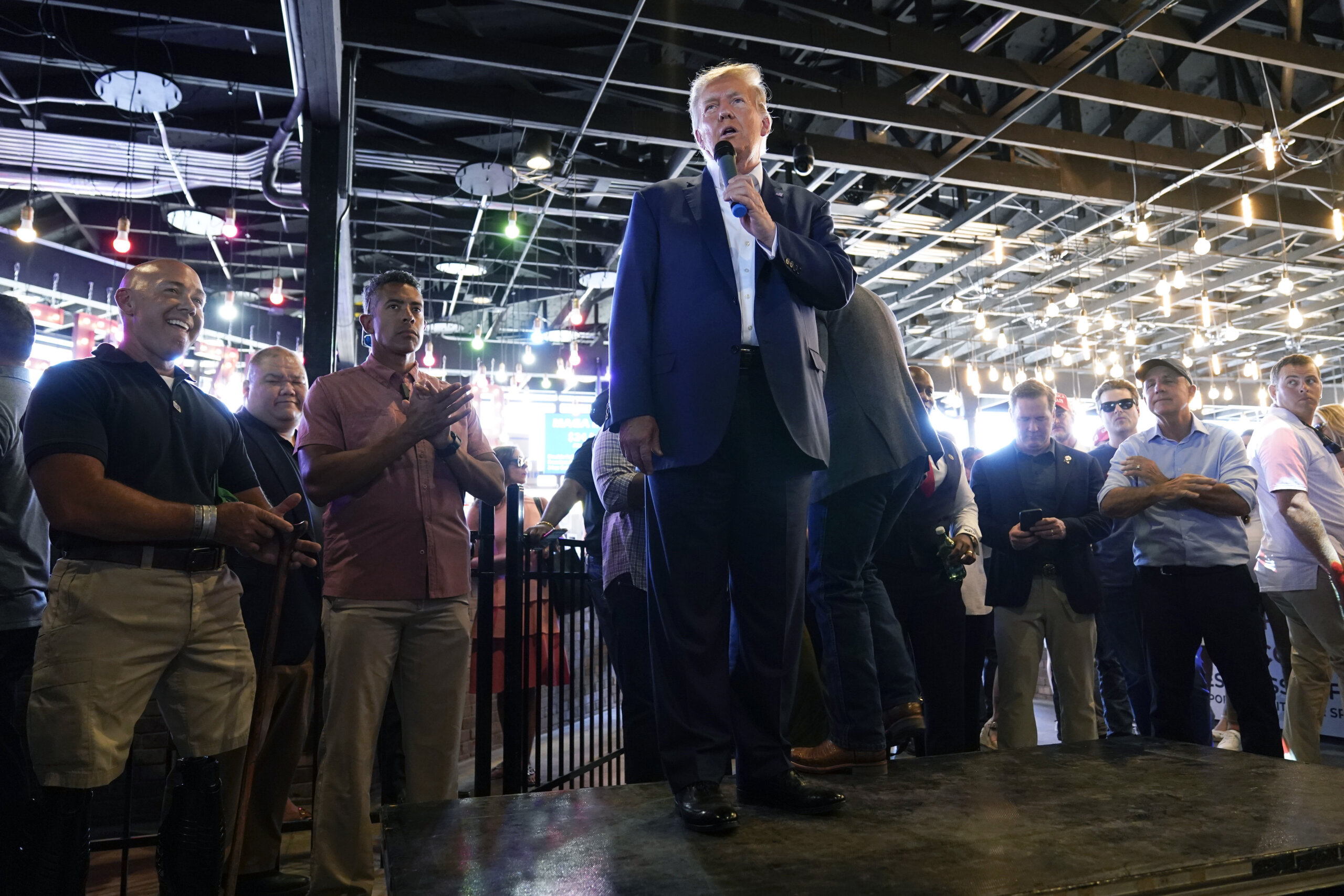 Trump finally arrived after an unscheduled stop at the Iowa Pork Producers that drew more than 1,000 spectators. Some people inside Steer N Stein watched the spectacle on their phones while awaiting his arrival.