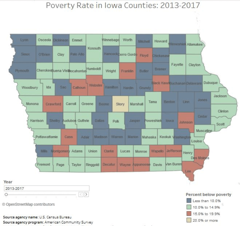 This data shows the percent of Iowans below the Federal poverty level. Medicaid, SNAP, and other programs allow a much higher threshold to qualify. To qualify for Medicaid, you can earn 138% of the Federal poverty rate. That means those earning 38% more than those represented in the map above are most likely on Medicaid as it is their only option for healthcare. This increases these percentages dramatically.