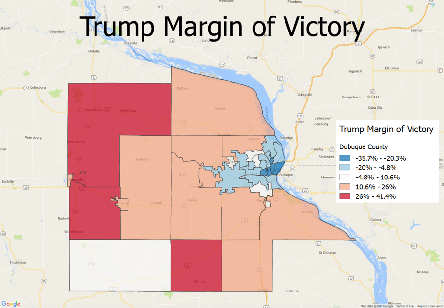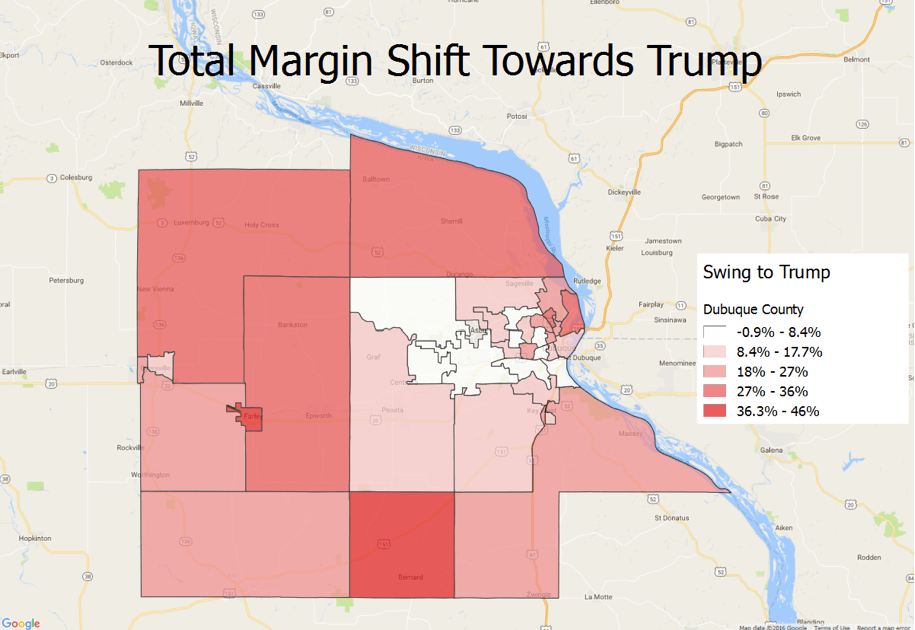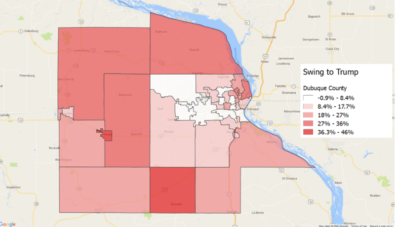 The Iowa Secretary of State’s office released the official canvass last month, which allows us to now take a close, detailed look at precinct-by-precinct results, and compare them to 2012. Much of what you find in the Dubuque County precinct results confirms the national trends: rural areas backed Republicans in overwhelming numbers, many blue collar Democrats switched to Trump and turnout was down in reliably Democratic areas.