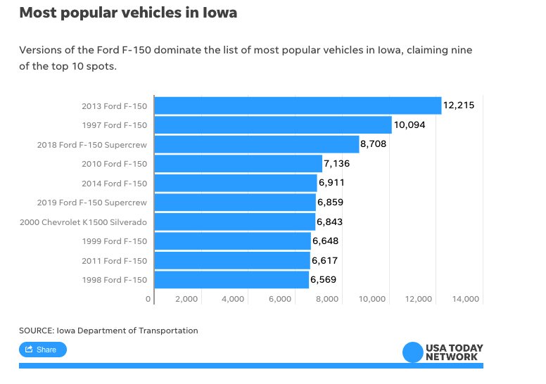 Notably, that average price of an EV is only slightly higher than the sticker price of a new full-size pickup truck, which retails for $62,470, according to same Kelley Blue Book article. And do you have a guess as to what is the most popular vehicle in Iowa? The Ford F-150, a full-size pickup truck.