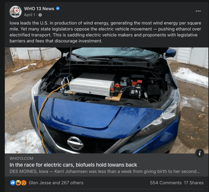 In Iowa, it’s reasonable to assume this animosity is ramped up because EVs are seen as a direct threat to ethanol (see the above section).