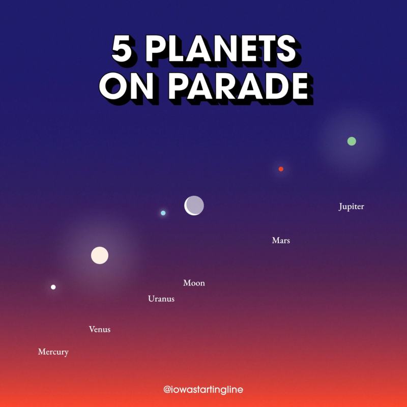 Five planets—Mercury, Jupiter, Venus, Uranus and Mars—will line up near the moon.