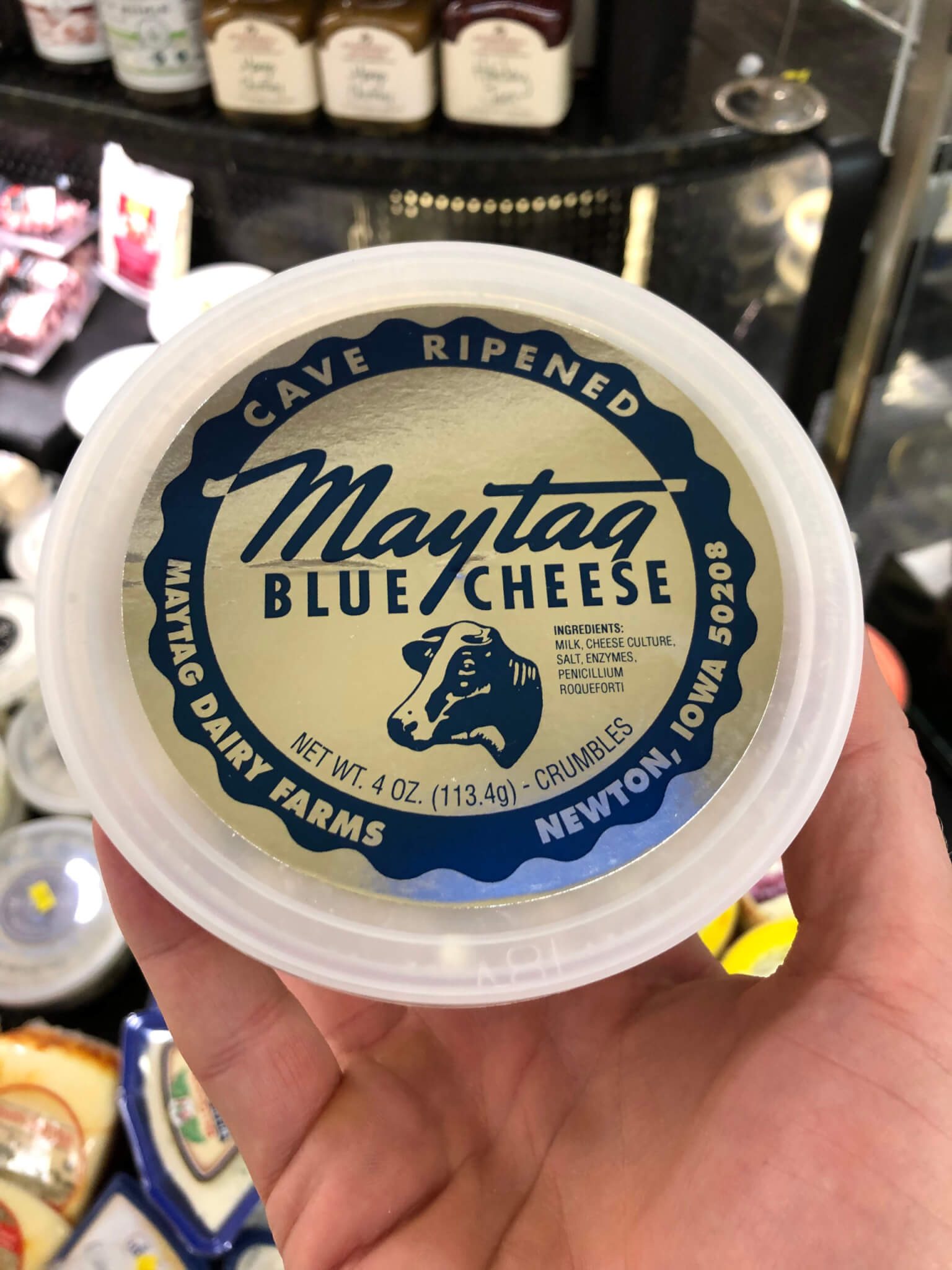 The cheese was originally made from the milk of the Maytag family’s herd of award-winning Holstein cattle. In present times, the milk comes from Holstein cattle from local Iowa dairy farms.