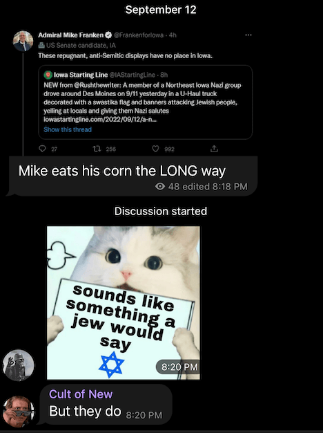The group of Nazis who spread anti-semitic messages around Des Moines on 9/11 got their feelings hurt by Democratic Senate candidate Mike Franken yesterday.