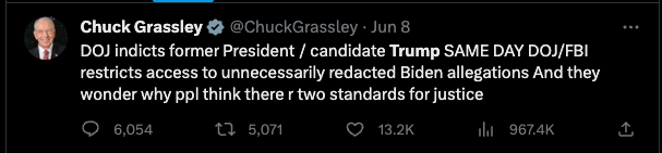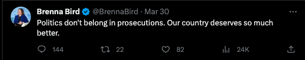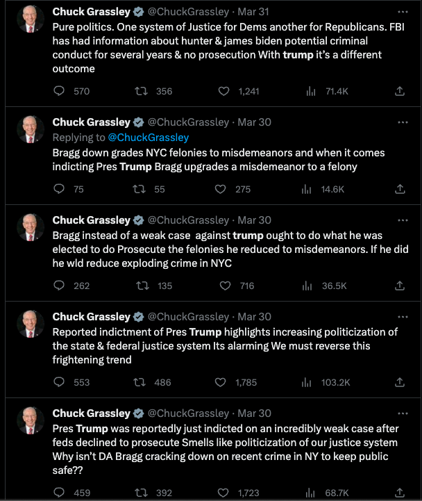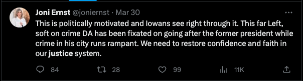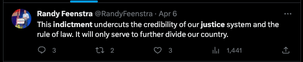 Except for US Rep. Ashley Hinson (R-Iowa), who tweeted “Another Biden scandal, another Trump indictment – just like clockwork. We must stop this unAmerican politicization of the judicial system,” it was crickets from Iowa’s most prominent Republicans. Hinson also used that same message to send out a fundraising text message