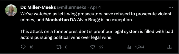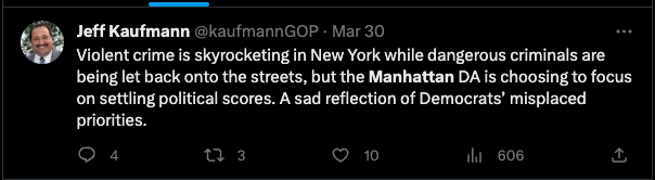 “While New York faces an open season for crime, the Manhattan DA is focused on arresting a former president,” her statement said. “This is what an assault on democracy looks like – using government power to go after your political opponents – and it’s coming directly from those who proclaim to ‘defend’ it.”