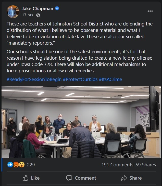 At a school board committee meeting in Johnston Thursday night, Iowa Sen. Jake Chapman said there should be criminal charges against teachers who allow children to read books he believes are obscene. He later followed up in a Facebook post saying he would prepare legislation for the upcoming session that would allow felony charges to be brought against those teachers.