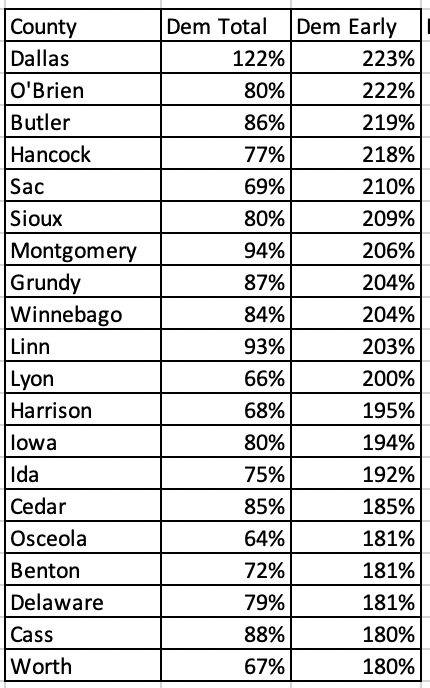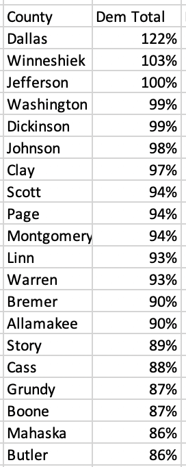 The best news for Democrats is that four of the largest counties — Scott, Linn, Johnson and Dallas — are all above 90%. Though Polk County isn’t in the top ten, they’re still at 84% of their 2016 turnout, no easy feat to accomplish with such a high population and so many ballots to go chase.