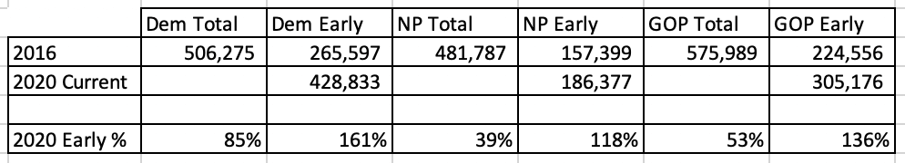 While both Democrats and Republicans have surpassed their 2016 early vote totals in every single county, there are 26 counties where the number of No Party ballots cast still have not reached their 2016 numbers. That seems… odd.