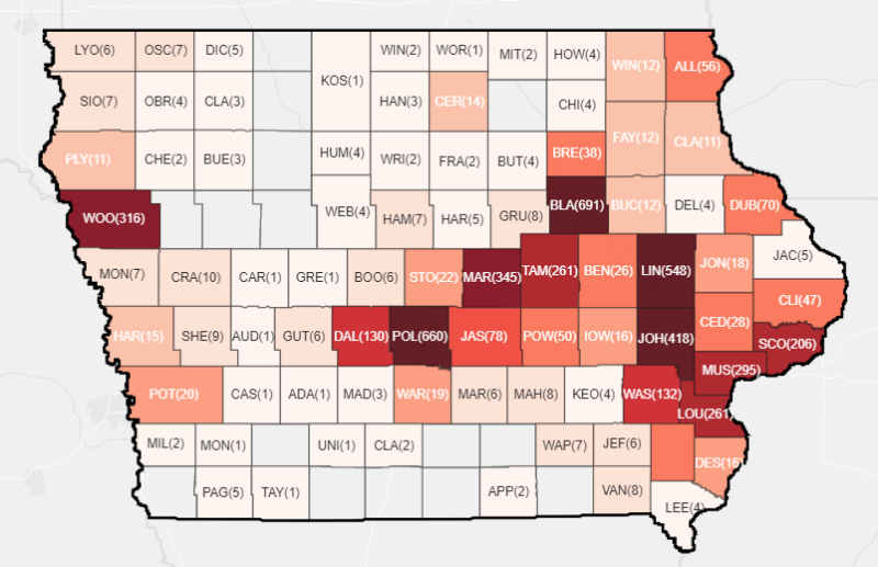 Black Hawk County now has the highest number of cases in the state with nearly 800. There, a Tyson Fresh Meats plant in Waterloo was the biggest source of the outbreak. The plant finally shut down after local leaders put pressure on the company.