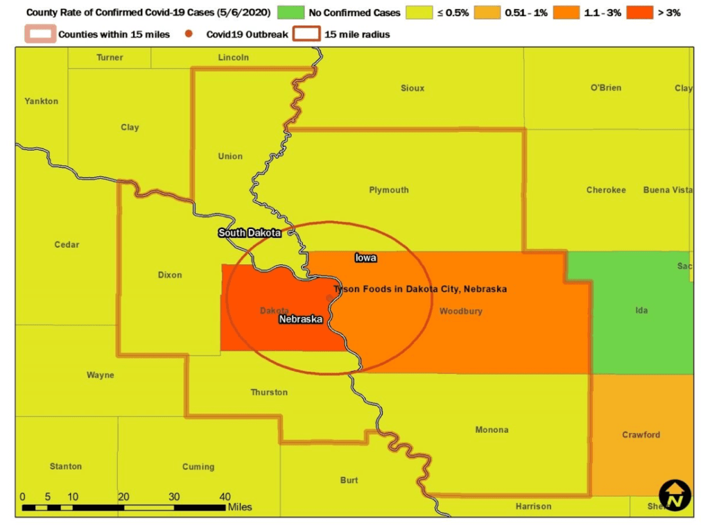 Dakota City, Nebraska, also borders Iowa. More than 600 cases were confirmed at the Tyson plant there. In the seven counties within Dakota County’s radius, 2,386 COVID-19 infections were reported.