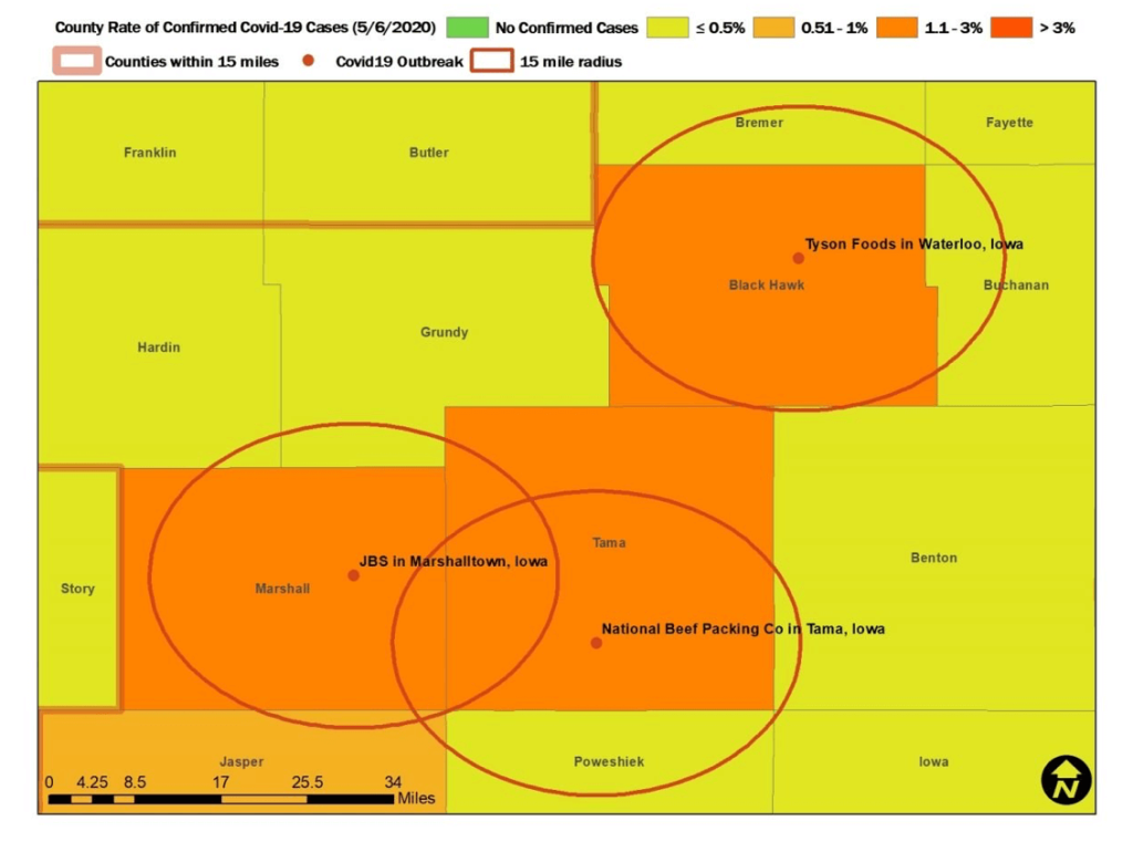 JBS in Marshalltown reported 34 cases at its plant between March 23 and May 6, but for counties within a 15-mile radius of Marshall County, 1,262 cases of COVID-19 were reported. National Beef Packing Co. in Tama only is 23 miles from JBS. More than 250 cases were reported at the Tama beef plant, with 1,292 cases within a 15-mile radius of Tama County.