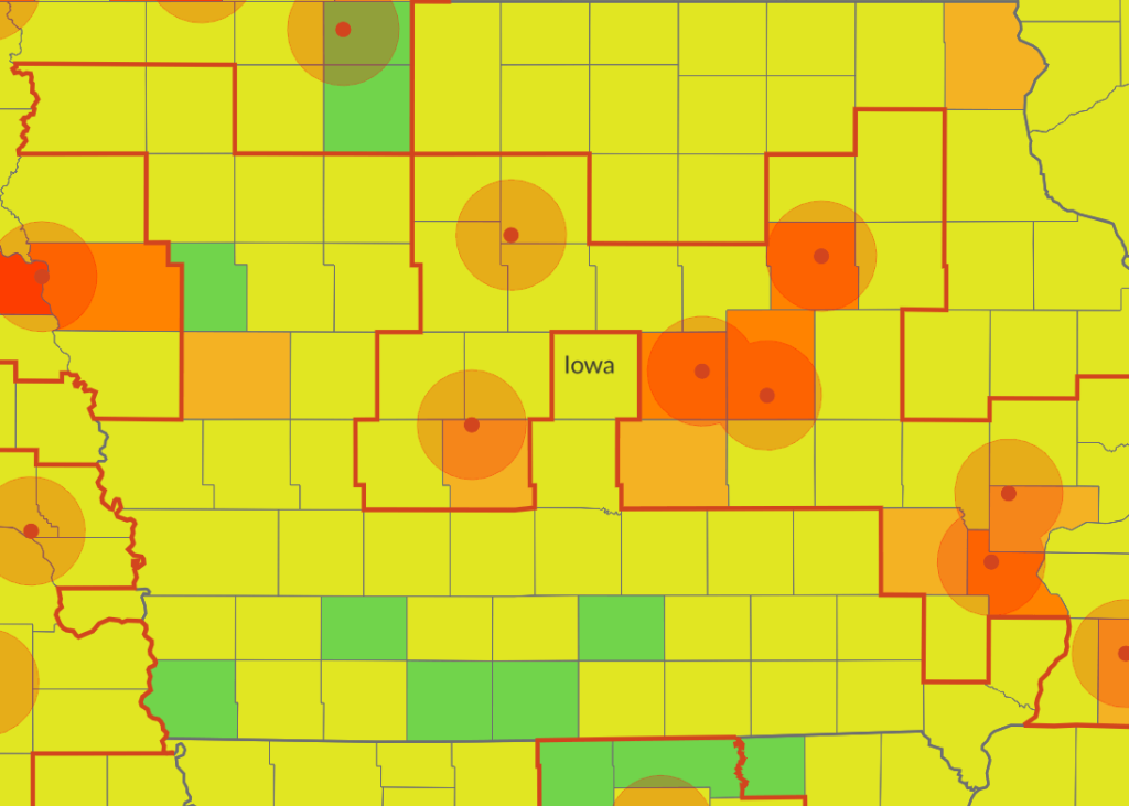EWG’s analysis cites eight Iowa meatpacking plants with known cases of COVID-19 as of May 6: Tyson, Columbus Junction; West Liberty Foods, West Liberty; National Beef Packing Co., Tama; JBS, Marshalltown; Tyson, Waterloo; Tyson, Perry; Prestage Foods, Eagle Grove; and Redwood Farms Meat Processors, Estherville. Earlier this week, IDPH announced that there was an additional outbreak at Upper Iowa Beef in Lime Springs.