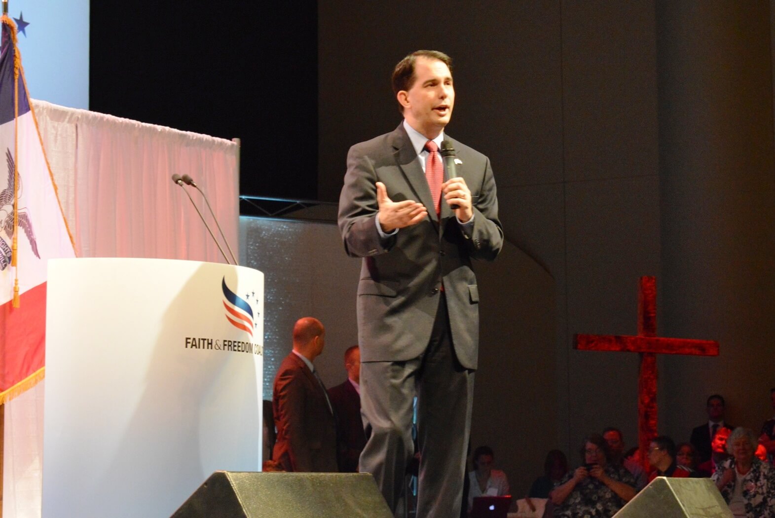 Scott Walker Faith and FreedomHe started out a little dull, but Scott Walker finished strong as the last speaker of the night. He was the only person to bring a prop on stage with him, reading from a devotional book one of his favorite passages. He gave a good story about how his faith helped him through the recall elections, and about the passage that a friend gave him in case he lost, which he found deeper meaning in after his victory. It connected well with the crowd, and was a smart move.