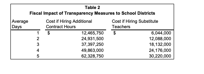 The LSA fiscal note breaks down how much this proposal would cost per day based on the average Iowa full-time teacher salary and the cost of a substitute teacher at $160 dollars per day: