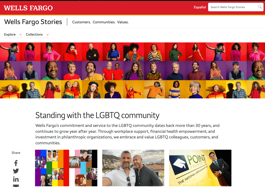 Under a section titled “Standing with the LGBTQ community,” Wells Fargo states that its “commitment and service to the LGBTQ community dates back more than 30 years, and continues to grow year after year. Through workplace support, financial health empowerment, and investment in philanthropic organizations, we embrace and value LGBTQ colleagues, customers, and communities.”