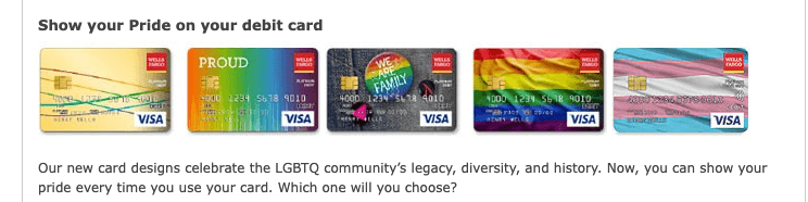 Another section of the site called the “LGBTQ Resource Center” offers customers a chance to receive credit and debit cards that “celebrate the LGBTQ community’s legacy, diversity, and history.” Those designs even feature the Gay Pride flag, the Trans Pride flag, and a rainbow gradient with “PROUD” in all capital letters at the top.