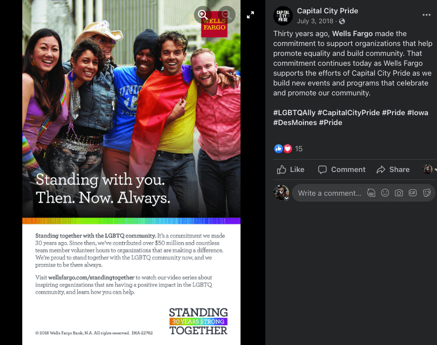 In Iowa, Wells Fargo has been a consistent sponsor of Capital City Pride, the state’s largest pride festival.