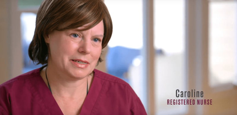 The ad features Caroline, a registered nurse, talking about problems she frequently sees her patients dealing with.