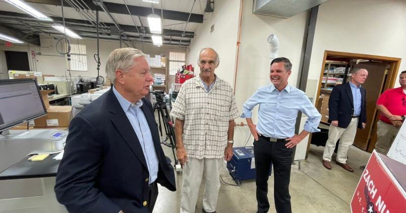 Sen. Lindsey Graham, Mark Daggy, and Congressional Candidate Zach Nunn talk during a visit to one of Daggy's Des Moines businesses. Photo from Zach Nunn's Twitter.