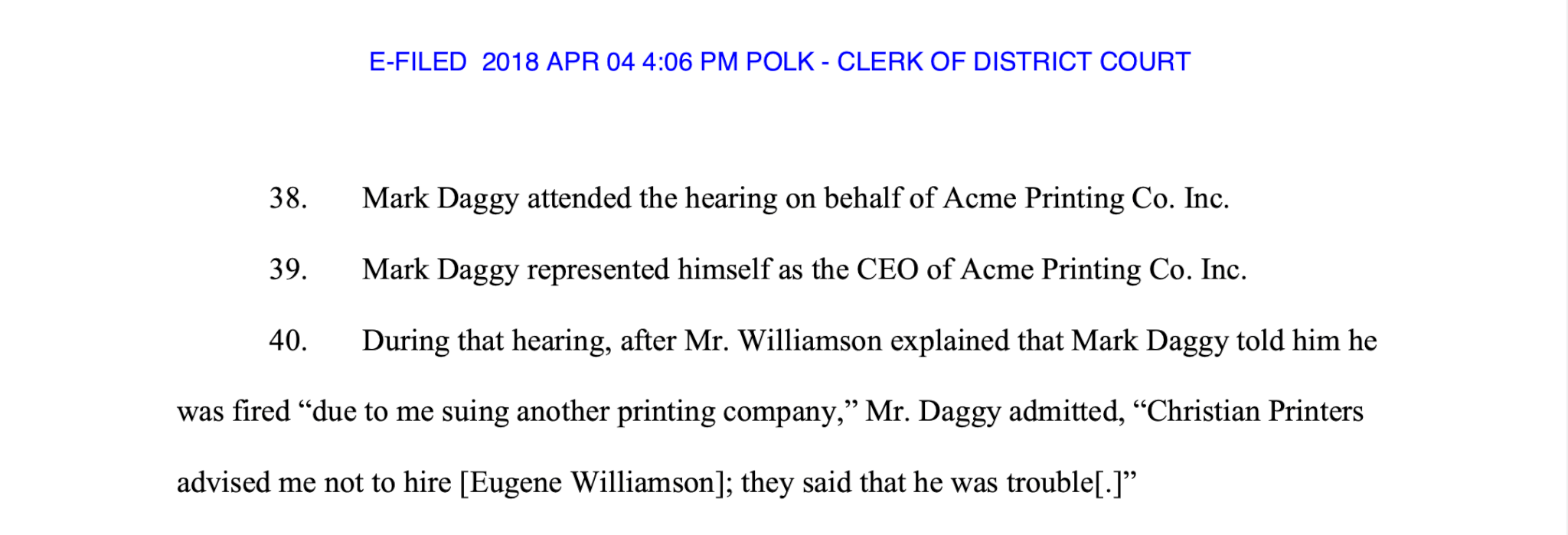 Screenshot from Eugene Williamson’s lawsuit against Mark Daggy.