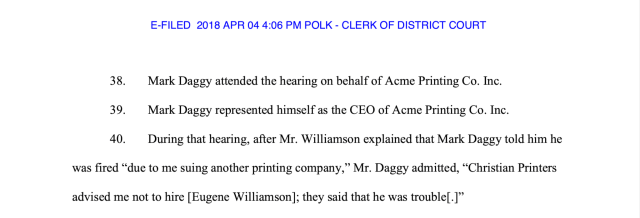 Williamson, who is Black, said Daggy told him he was fired because he had filed an Iowa Civil Rights Commission complaint against a former employer for racial discrimination. Daggy admitted being warned about Williamson in an unemployment hearing when the fired employee sought benefits.